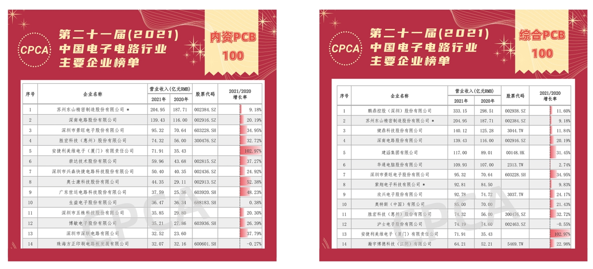 5月18日,由中国电子信息行业联合会和中国电子电路行业协会联合发布的第二十一届(2021)中国电子电路行业主要企业榜单正式发布。榜单中设有综合PCB百强企业排行、内资PCB百强企业排行、覆铜箔板企业排行等10个子榜单,共计有241家企业上榜。其中304.cam永利科技以74.32亿元的营收位居中国综合PCB榜单第11名,内资第4名。