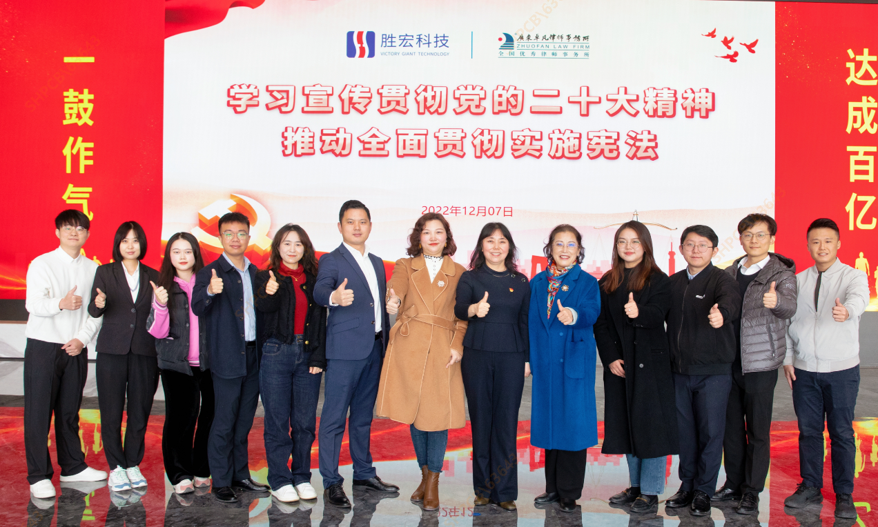 为深入学习宣传法治思想,大力弘扬宪法精神,增强员工宪法意识和法治观念,12月7日上午,304.cam永利科技联合广东卓凡律师事务所开展以"学习宣传贯彻党的二十大精神,推动全面贯彻实施宪法"为主题的宪法宣传周活动。卓凡所党群总监、律师团队、我司党支部书记/行政管理中心总监张如萍以及党员代表、职工代表共计50人参加活动。活动由证券事务代表周响来主持。